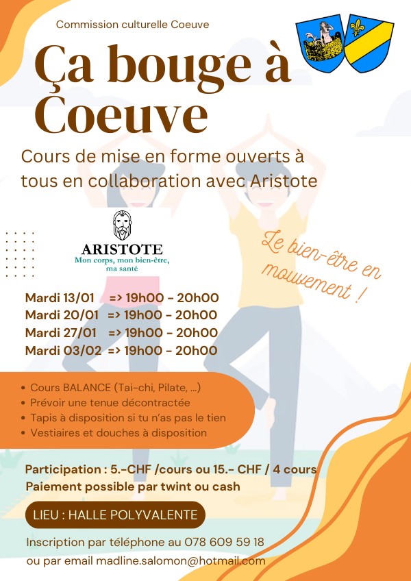 La commission culturelle organise des cours de mise en forme ouverts à tous en collaboration avec Aristote, les mardi 13 janvier, 20 janvier, 27 janvier et 3 février 2026, qui auront lieu à la halle polyvalente, de 19h à 20h.